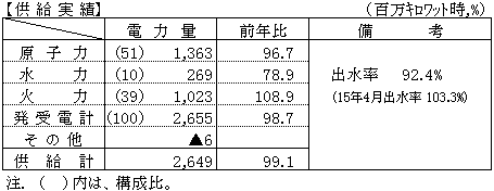 - 原子力は、伊方発電所2号機の定期検査の影響から、対前年比96.7%となった。