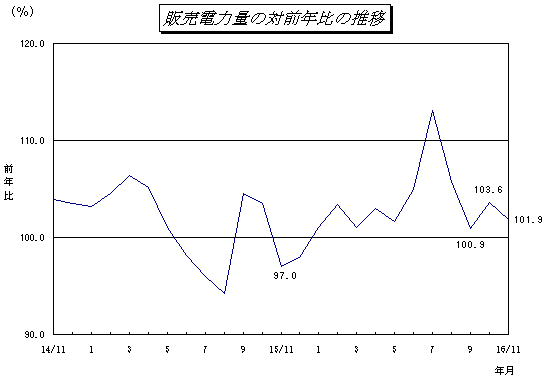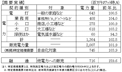 電灯は、6億4千3百万キロワット時、対前年比100.5%、電力は13億6千4百万キロワット時、対前年比102.5%となり、販売電力量では、20億7百万キロワット時、対前年比101.9%となった。(11か月連続のプラス)