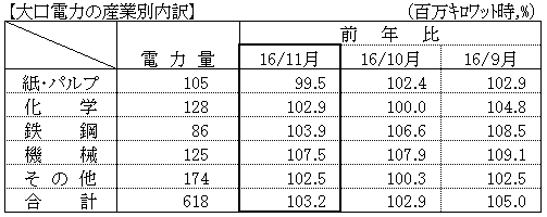 - 大口電力は、鉄鋼、機械における生産増などから、対前年比は103.2%となった。(15か月連続のプラス)