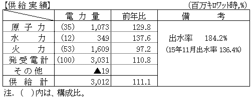 - 原子力は、定期検査の影響により、対前年比129.8%となった。