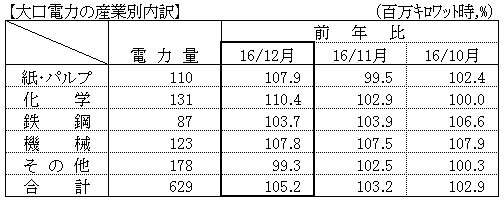 - 大口電力は、化学、機械における生産増などから、対前年比は105.2%となった。(16か月連続のプラス)