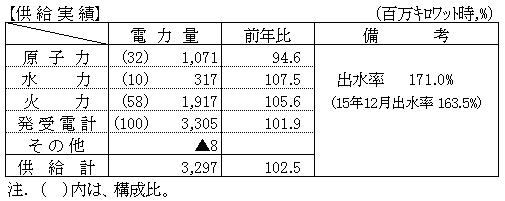 - 原子力は、定期検査の影響により、対前年比94.6%となった。