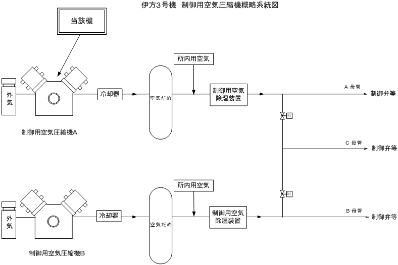 現在は空気圧縮機Bに切り替えて運転を継続しており、制御用空気の供給に支障はなく、本事象によるプラントの運転への支障はありません。また、外部への放射能の影響はありません。