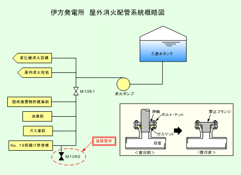 その後、当該消火配管は消火用として使用していないことから、接続が外れた配管を取り外し、閉止フランジを取り付け、9月24日11時15分、漏えいのないことを確認し、通常状態に復旧しました。