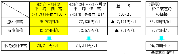 平成21年6月分の電気料金に適用される燃料費調整単価については、以下のとおり算定いたしました。