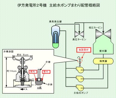 6月27日18時10分頃、定期検査中の伊方発電所2号機のタービン建家地下1階(管理区域外)において、主給水ポンプC号機のポンプの空気抜弁に異常があることを保修員が確認しました。