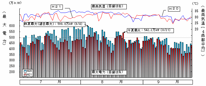 今夏の最大電力は、平成11年以来の低い水準となった。