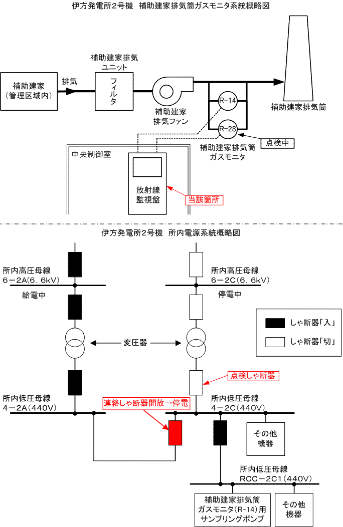 伊方発電所2号機は定期検査中のところ、昨日17時53分頃、所内低圧母線の停電により、補助建家排気筒ガスモニタ※(R-14)による監視が、一時的に停止しました。(R-28は点検中)