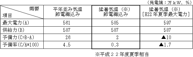 こうした状況を踏まえ、今夏においては、この冬にお願いした「節電」を引き続きお願いするとともに、特に需給が厳しい期間の平日昼間時間帯については、7%以上(一昨年比)を目標に節電をお願いせざるを得ないと判断いたしました。