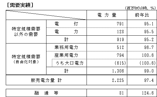 - 事務所ビル・大型商店などの「業務用電力」は、電灯と同様に気温の影響などから、前年比96.7%となった。