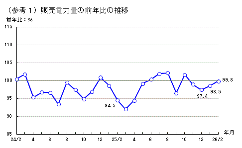 平成26年2月分の販売電力量は、23億6千3百万キロワット時、前年比99.8%となった。