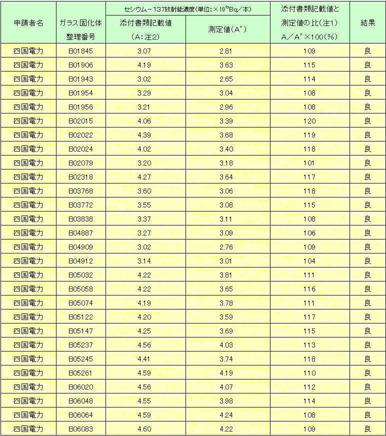 ただし、当該ガラス固化体(B01845,B01943,B01954,B01956)については、62%≦添付書類記載値と測定値の比≦163% |