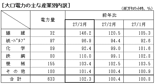 - 産業用の「大口電力」は、化学が前年を下回ったものの、繊維や鉄鋼が前年を上回ったことなどから、前年比102.3%となった。