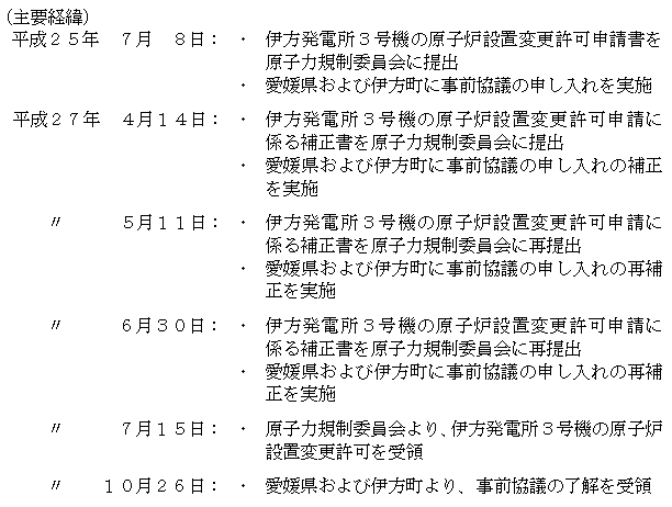 当社は、平成25年7月8日、新規制基準の施行に伴う伊方発電所3号機の原子炉設置変更許可申請について、安全協定に基づき、愛媛県および伊方町に対し、事前協議を申し入れておりましたが、本日、同県および同町より、ご了解をいただきましたのでお知らせいたします。