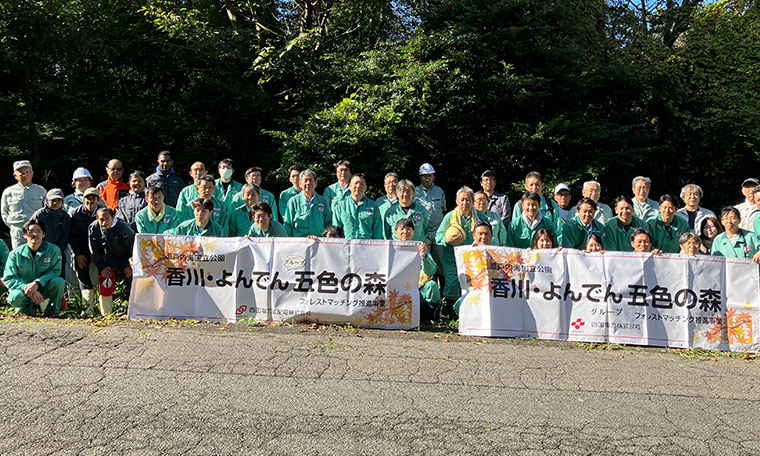 2008年から行政や地元住民の皆さまなどと共に、長年に渡り活動している「よんでん五色の森」の森林保全活動ですが、今年度は植樹したもみじの木の周辺の下草刈りや除伐を実施し、森の健全な育成に貢献しました。自然と人が共生する環境づくりを、これからも進めていきます。