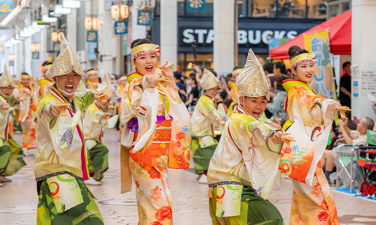 よんでんグループとして、四国各地の夏祭りに積極的に参加し、地域のにぎわい創出に貢献しています。2025年は、さぬき高松まつり、松山野球拳おどり、阿波おどり、よさこい祭りなど、各県を代表するお祭りに参加して演舞を披露しました。これからも地域の一員として、受け継がれてきた地域の情熱や文化を次代につないでいきます。 (写真は、高知市のよさこい祭りの様子)