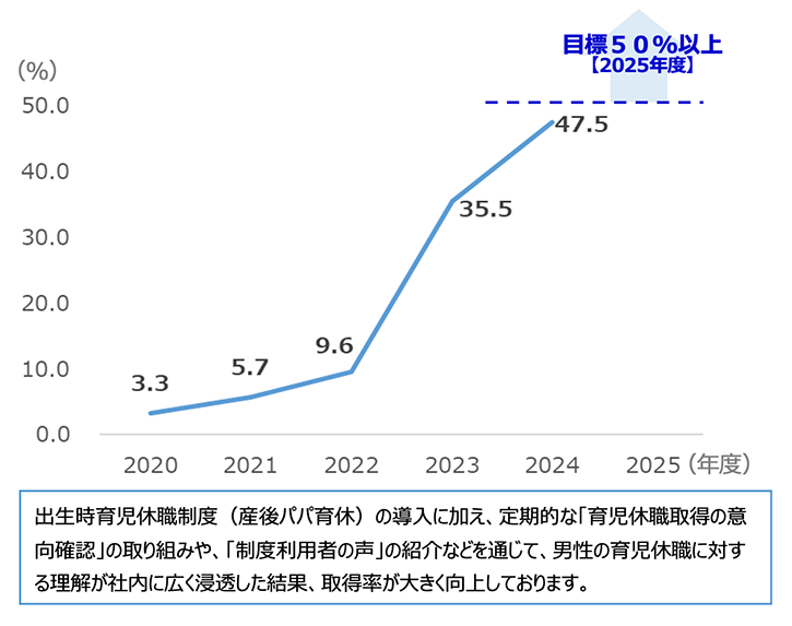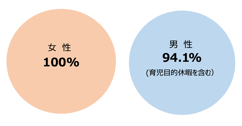 当社では、「女性の育児休職取得率100%を継続するとともに、2025年度末までに男性の育児休職取得率※を50%以上とする」という目標を掲げて、取り組みを進めています。