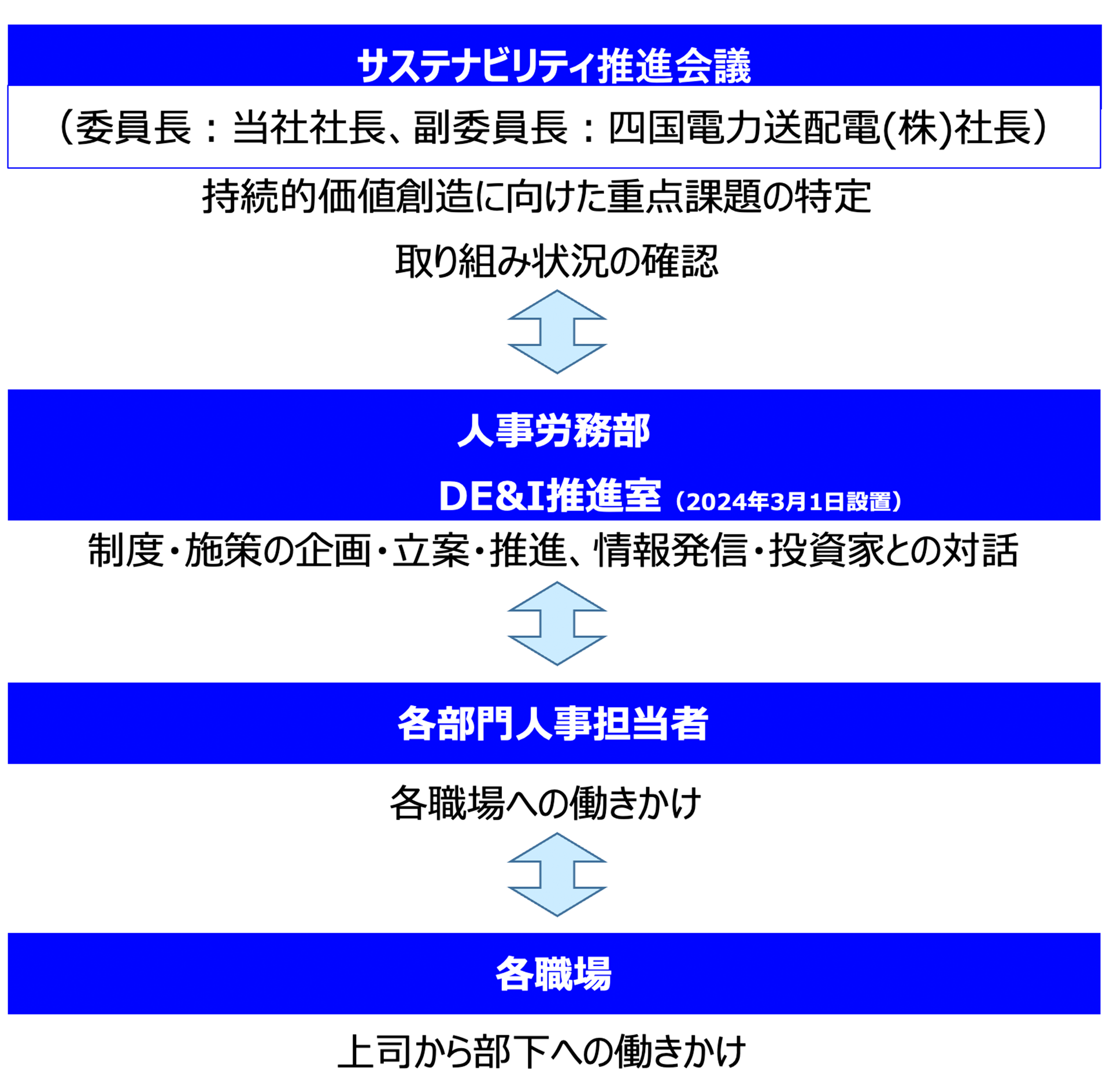 当社社長が委員長を務めるサステナビリティ推進会議において、DE&I推進を持続的価値創造に向けた重点課題として特定し、アクションプランの審議や取り組み状況の確認を行っています。