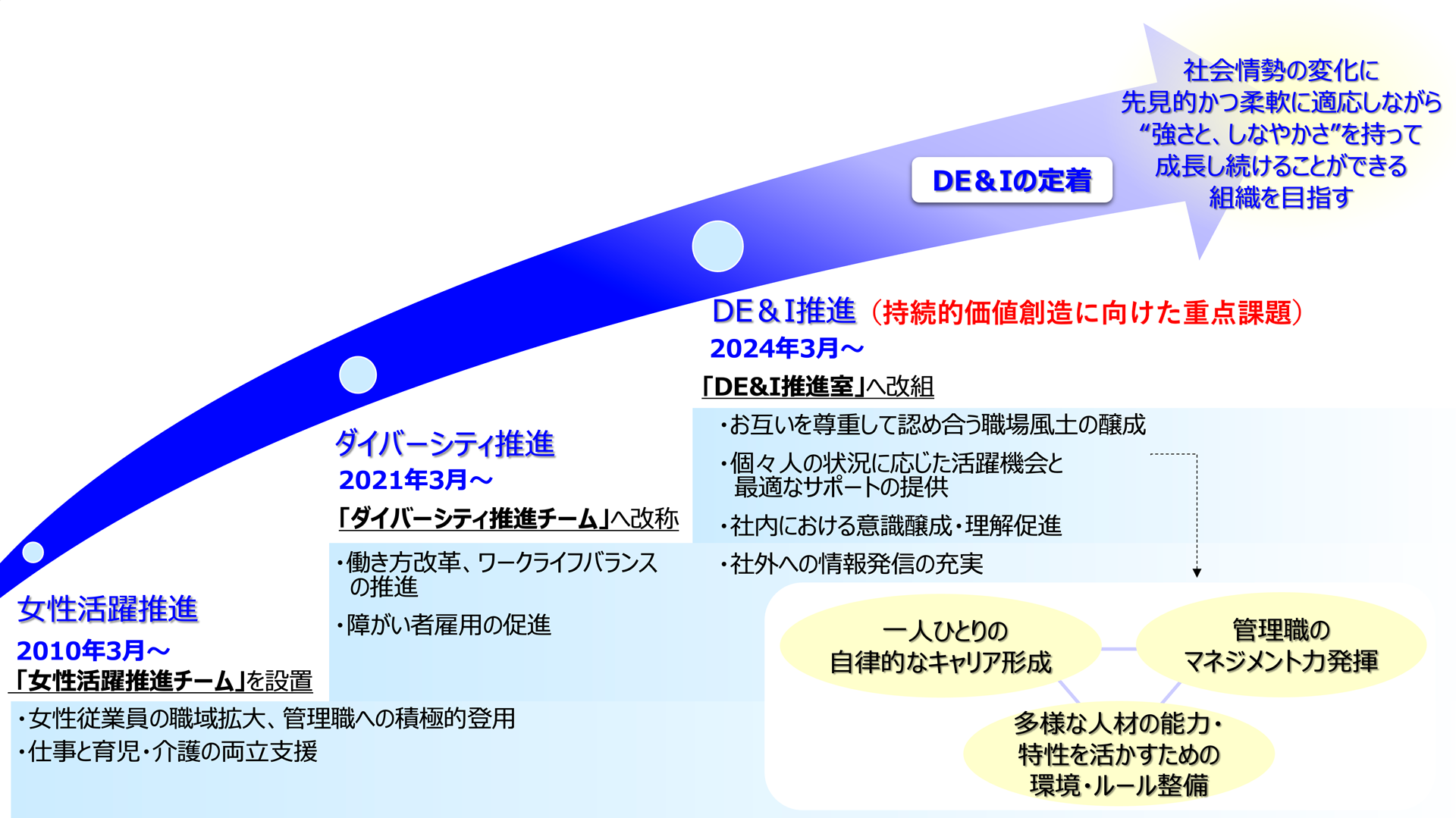 取り組みの推進にあたっては、人事労務部に設置されたDE&I推進室が中心となり、制度・施策の企画・立案や、各部門の人事担当者とも連携した各職場への働きかけ、さらには対外的な情報発信や投資家との対話を通じた理解促進とさらなる取り組みの充実を図っています。