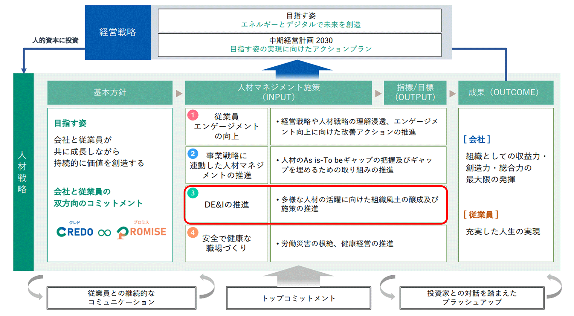 当社グループでは、「人」こそがサステナビリティを推進するための最大の原動力(最大の財産)であるという考えのもと、「ダイバーシティ・エクイティ&インクルージョン(DE&I)の推進」を人的資本に関する経営上の重点課題の一つと位置付け、積極的に取り組む方針としています。